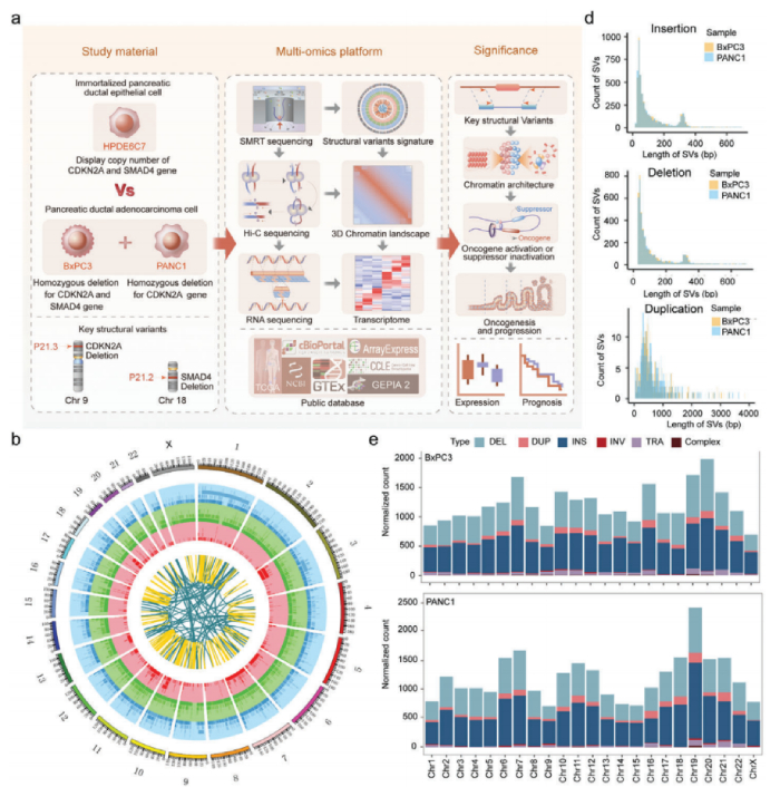 研究人員通過(guò)整合三代人重測序、高通量染色質(zhì)構象捕獲( Hi-C) 和 RNA-seq等多組學(xué)技術(shù),對源自人胰腺導管上皮的胰腺癌細胞和正常人胰腺導管上皮細胞進(jìn)行了深入研究和綜合分析,成功揭示了PDAC細胞中SV的特征圖譜和染色體空間結構的多尺度重塑,并進(jìn)一步闡釋了SV與染色質(zhì)三維結構之間的復雜的相互作用及其對基因表達的影響。這一發(fā)現為全面了解SV在胰腺癌發(fā)展中的致病機制提供了全基因組資源和新的空間視角,這可能有助于識別新的預后標志物和治療靶點(diǎn)。