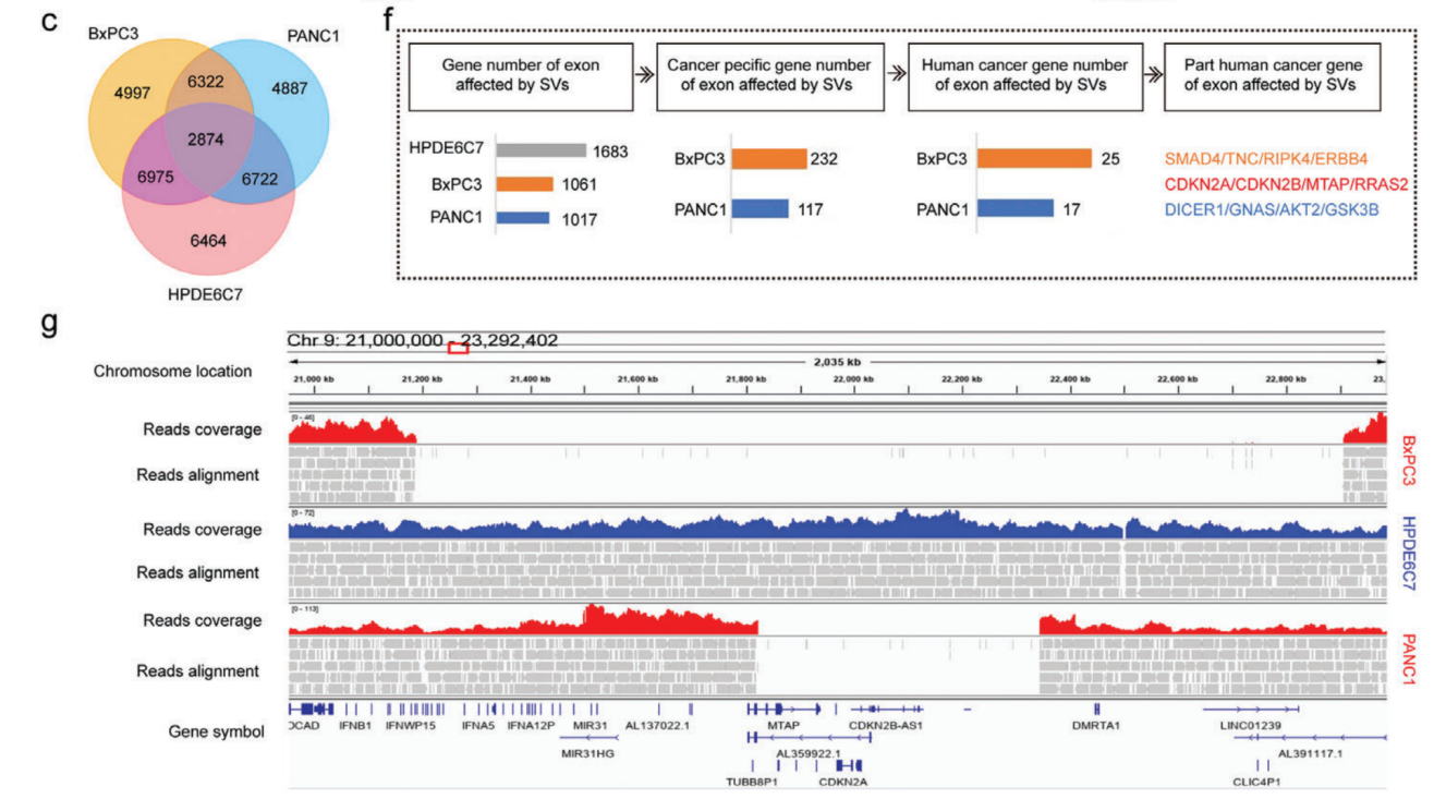 研究了在其外顯子區域受到SV直接影響的基因,并分別在PANC1、BxPC3和HPDE6C7中檢測到了1017、1061和1683個(gè)基因的變化。在PANC1中獨立檢測到14號染色體上的DICER1擴增,19號染色體上的AKT2缺失和20號染色體上的GNAS插入。在BxPC3中特異性地檢測到9號染色體上的TNC缺失,11號染色體上的RRAS2插入和18號染色體上的SMAD4缺失。BxPC3樣本中還存在許多基因大片段缺失,長(cháng)度超過(guò)1.7 Mb,包括CDKN2A、CDKN2B、MTAP和DMRTA1等基因?;陂L(cháng)讀長(cháng)測序結果建立了人類(lèi)胰腺癌中SV的特征,為全面研究SV在這種致命惡性腫瘤中的發(fā)病機制提供寶貴的資源。