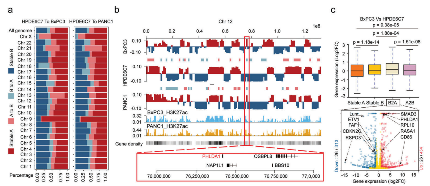 PADC中染色質(zhì)A/B室置換分析,與正常細胞相比,BxPC3中A/B置換的總發(fā)生率分別為24.8%(A到B,15.3%;B到A,9.5%)和PANC1中的24.1%(A到B,16.2%;B到A,7.9%)。A/B置換與基因密度和調節活性的變化有關(guān),穩定的A和B室到A室置換是具有活性轉錄的基因豐富的區域,而穩定的B室和A室到B室置換具有相反的特性,RNA-seq數據相結合也證實(shí)這一結論。其中癌癥樣本中PHLDA1是位于12號染色體共同B到A室置換的基因,在兩個(gè)癌細胞系中都顯著(zhù)上調,PHLDA1在幾種惡性腫瘤中顯著(zhù)上調,包括胰腺癌、低級膠質(zhì)瘤和黑色素瘤,它與胰腺癌預后不佳顯著(zhù)相關(guān)。這些結果表明兩個(gè)癌細胞系(BxPC3和PANC1)中染色質(zhì)A和B室的空間分布發(fā)生了變化,這些轉變與癌癥相關(guān)基因的表達變化顯著(zhù)相關(guān)。