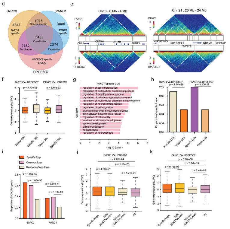 PDAC中的接觸域(CD)改變分析,拓撲關(guān)聯(lián)域(TAD)是染色質(zhì)結構的功能單位,這里利用高分辨率Hi-C(5kb)測序檢測正常細胞系和癌細胞系的接觸域邊界(CDB),在HPDE6C7、BxPC3和PANC1細胞系中確定了14 581、14 318和13 494 CD,平均大小分別為211、227和214kb。CDB保存在人類(lèi)基因組中任何兩種細胞類(lèi)型之間共享的CDB很少,CD數量和大小的變化可能會(huì )在不同的染色體區域出現截然相反的變化。與共享的的CD相比,癌癥特異性CD區域與上調基因表達的關(guān)聯(lián)要大得多。這些癌癥特異性CD中差異表達基因的GO富集分析顯示,改變的基因涉及幾種關(guān)鍵途徑,包括癌癥促進(jìn)、細胞分化、細胞粘附、細胞運動(dòng)和遷移。