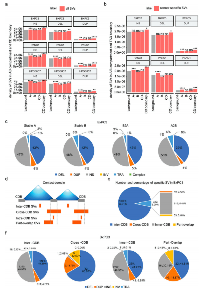 人體內SV的發(fā)生和形成往往受到染色體三維空間結構的影響,根據SV和染色質(zhì)A/B室之間的關(guān)系,除了BxPC3中的缺失外,BxPC3/PANC1/HPDE6C7樣本中染色質(zhì)A室都有顯著(zhù)的插入、缺失和重復變化,發(fā)現插入、其中在PANC1的染色質(zhì)A室中顯著(zhù)富集了缺失和重復變異,但在BxPC3的染色質(zhì)A室中顯著(zhù)存在重復變異,兩種癌細胞系之間A/B隔間中癌癥特異性SV的分布模式大不相同。