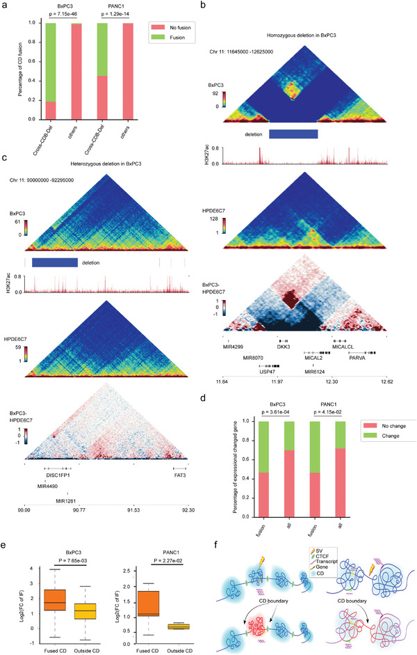 分析了兩個(gè)癌細胞系中CD融合與差異基因表達之間的相關(guān)性。結果表明,融合CD中差異表達基因的比例明顯高于基因組其他區域,總的來(lái)說(shuō),這些數據表明,癌癥特異性SV可以通過(guò)重塑PDAC中的CD來(lái)調節基因表達。