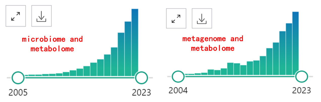而近年來(lái),關(guān)鍵詞“microbiome and metabolome”、“metagenome and metabolome”也是逐漸備受關(guān)注的熱點(diǎn)話(huà)題,PubMed搜索發(fā)文量也是逐年上升的趨勢。