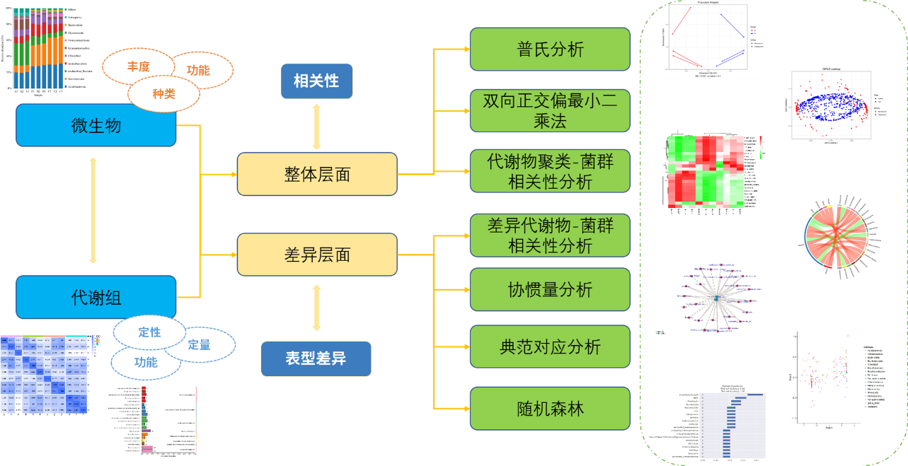 微生物和代謝組聯(lián)合分析從兩個(gè)層面去進(jìn)行聯(lián)合,整體層面去展示微生物和代謝物之間的整體相關(guān)性,比如普氏分析、代謝物聚類(lèi)-菌群相關(guān)性分析;從差異層面則基于不同的差異處理組,去進(jìn)一步聯(lián)系表型關(guān)系,看具體的微生物和代謝之間的關(guān)系是否與生物的表型差異相關(guān),這里則主要有差異代謝物和菌群相關(guān)性分析、協(xié)慣量分析、典范對應分析、隨機森林分析等,接下來(lái)我們就這些分析和大家具體看下怎么解讀和應用。