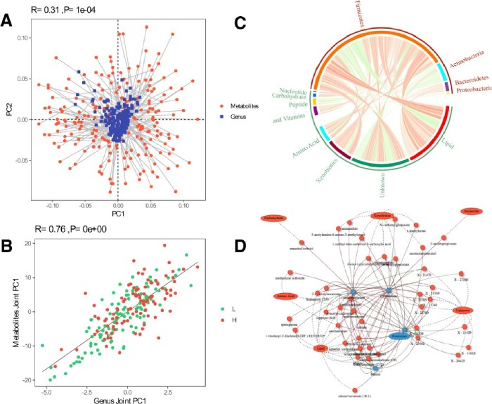 (A) Procrustes analysis (PA):連接兩點(diǎn)的線(xiàn)的長(cháng)度表示兩個(gè)數據集之間樣本的一致性。(B) O2PLS模型:O2PLS模型中具有較大的荷載值,被認為是它們相似性的重要因素。(C) 微生物和代謝物之間的spearman相關(guān)性的Circos圖。(D) 不同的代謝物和屬于韌皮部的微生物之間的spearman相關(guān)網(wǎng)絡(luò )。