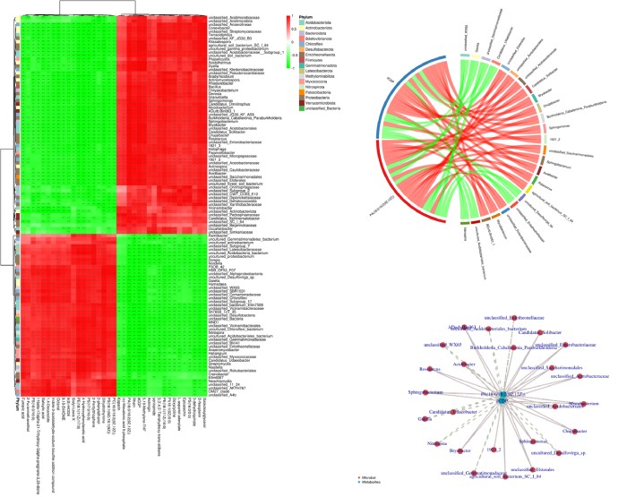 差異代謝物-差異菌群相關(guān)性熱圖(左)、差異代謝物-差異菌群相關(guān)性和弦圖(右上)、差異代謝物-差異菌群相關(guān)性網(wǎng)絡(luò )圖(右下)
