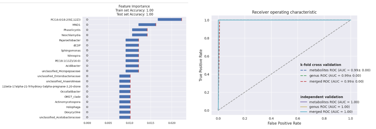 右圖注:虛線(xiàn)顯示訓練集K重交叉驗證的平均ROC曲線(xiàn),實(shí)線(xiàn)顯示獨立驗證的ROC曲線(xiàn)。不同顏色虛線(xiàn)和實(shí)線(xiàn)分別表示代謝組、微生物組(屬水平)分別建模以及合并建模的ROC曲線(xiàn)。
