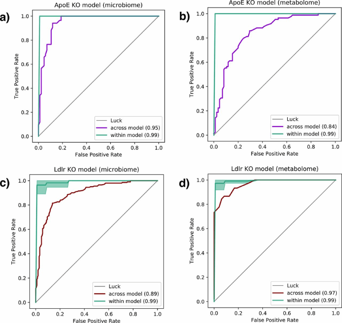 綠色曲線(xiàn)代表每個(gè)小鼠模型內的分類(lèi)準確性。紫色ROC曲線(xiàn)對應于使用來(lái)自ApoE-/-小鼠模型的腸道微生物組(a)和代謝組(b)數據訓練的模型,以預測Ldlr-/-小鼠的IHH暴露。紅色曲線(xiàn)顯示的是在A(yíng)poE-/-小鼠上測試的Ldlr-/-小鼠的微生物組(c)和代謝組(d)數據。IHH:間歇性低氧和高碳酸血癥。