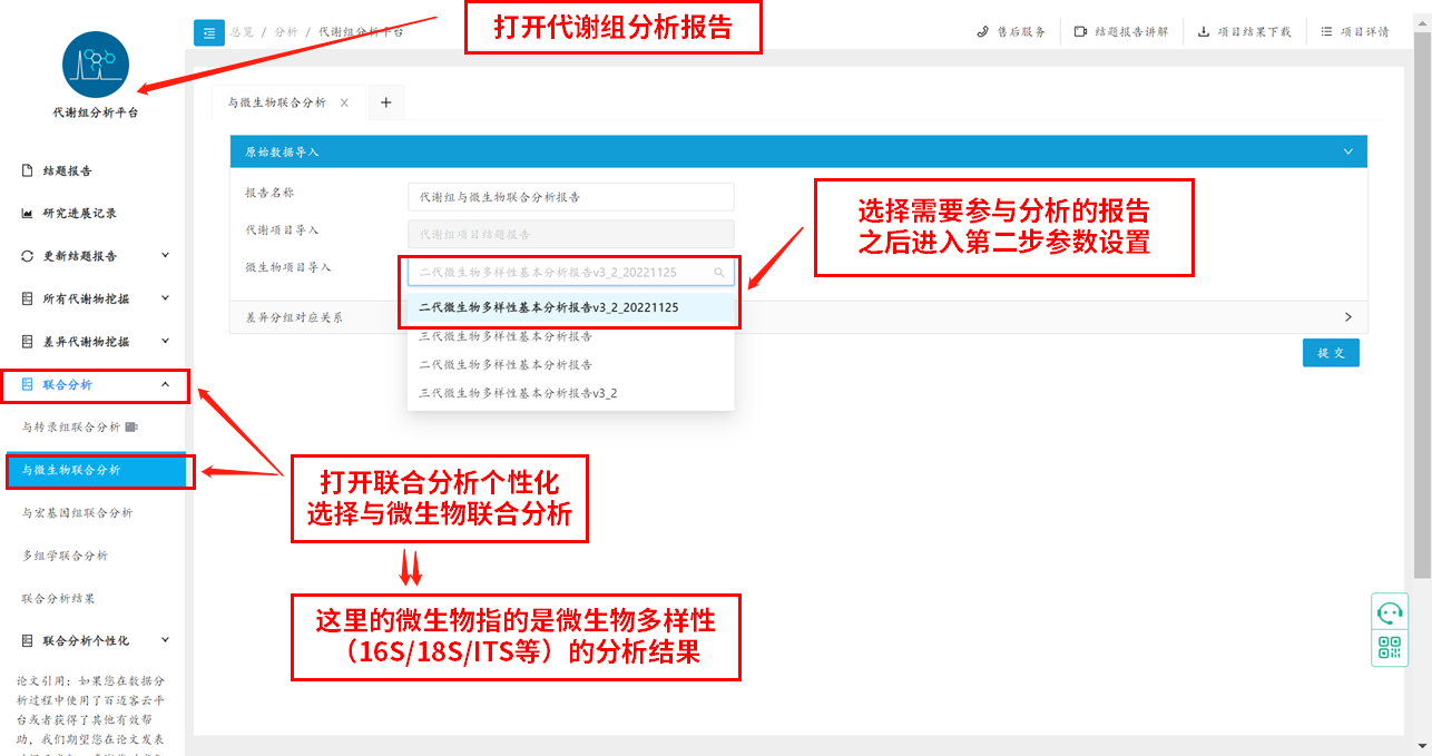 首先,我們進(jìn)入百邁客云平臺,打開(kāi)代謝組分析結題報告,在報告左側找到聯(lián)合分析模塊,然后選擇與微生物聯(lián)合分析個(gè)性化,再在右側選擇需要參與分析的微生物報告,之后進(jìn)入第二步參數設置,示例圖如下: