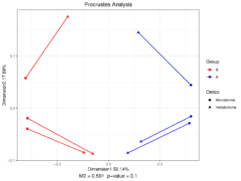 由于兩組數據集的屬性不同,并不適合用來(lái)直接比較,可分別對兩個(gè)數據集降維排序分析,并提取特征軸的坐標。本分析選用 PCoA 分別對微生物組(屬水平)和代謝組進(jìn)行降維排序,之后進(jìn)行Procrustes分析,比較微生物組與代謝組之間的相似和變異情況。