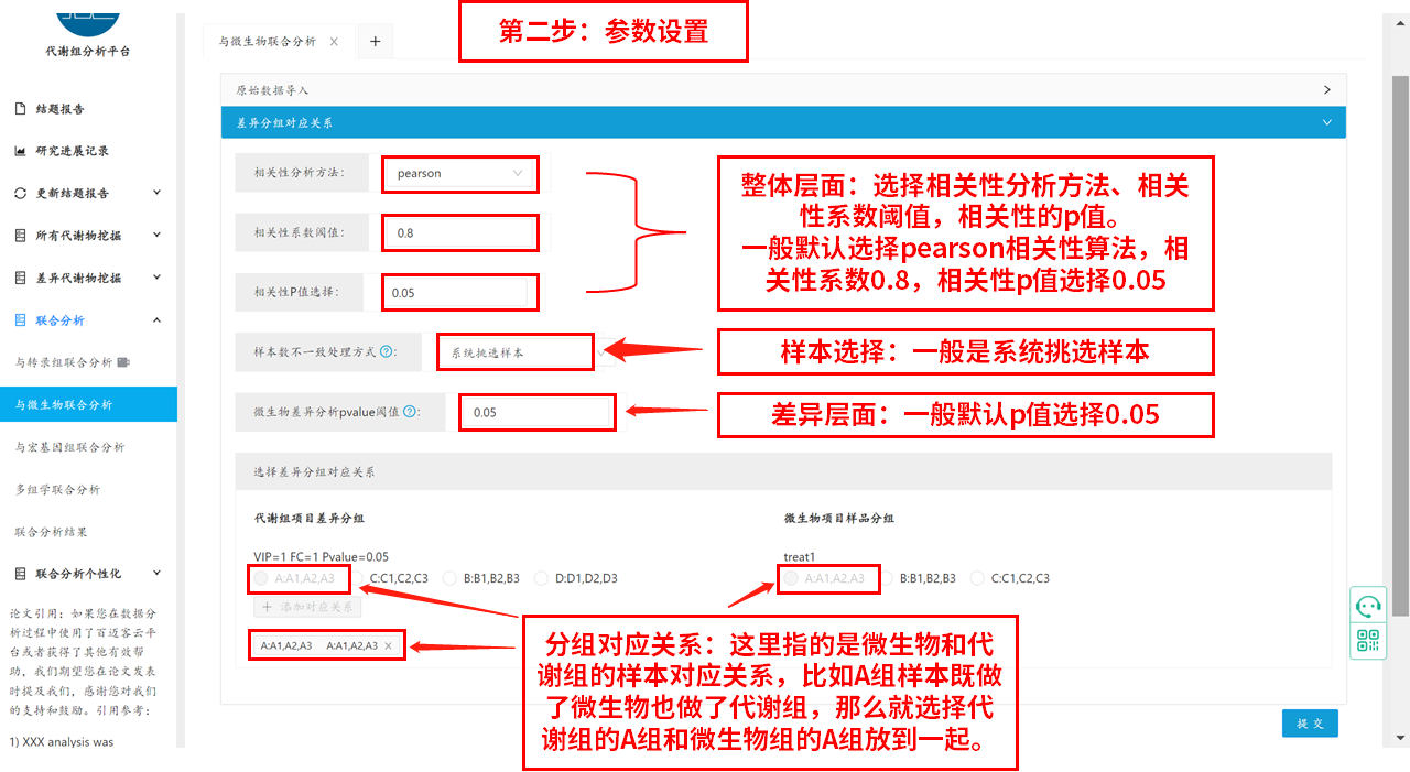 第二步參數設置:整體層面選擇相關(guān)性分析方法、相關(guān)性系數閾值,相關(guān)性的p值。一般默認選擇pearson相關(guān)性算法,相關(guān)性系數0.8,相關(guān)性p值選擇0.05。分組對應關(guān)系:這里指的是微生物和代謝組的樣本對應關(guān)系,比如A組樣本既做了微生物也做了代謝組,那么就選擇代謝組的A組和微生物組的A組放到一起,具體示例圖如下: