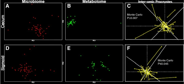 圖注:Procrustes分析:第一列圖表包含微生物組數據(紅點(diǎn)),第二列包含代謝組數據(綠點(diǎn))。第一行包含盲腸數據,第二行包含乙狀結腸數據。對盲腸微生物組(A)、盲腸代謝組(B)、乙狀結腸微生物組(D)和乙狀結腸代謝組(E)進(jìn)行主成分分析。然后進(jìn)行樣本點(diǎn)間(C和F) Procrustes分析。Procrustes圖上的線(xiàn)越長(cháng),表明微生物組和代謝組的對象內差異越大。所示的顯著(zhù)性值是使用Vegan R軟件包中的protest函數計算的,該函數進(jìn)行重復的對稱(chēng)Procrustes分析以估計顯著(zhù)性。
