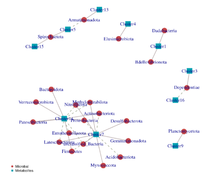 注: 圖中代謝物簇用藍色方形標出,微生物用紅色圓形標出。實(shí)線(xiàn)代表正相關(guān),虛線(xiàn)代表負相關(guān)。