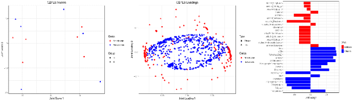 O2PLS 聯(lián)合樣本得分圖(左)、O2PLS 模型微生物和代謝物的載荷圖(中)、O2PLS 關(guān)聯(lián)程度大的微生物/代謝物柱狀圖(右)