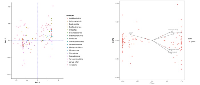 典范對應分析(canonical correspondence analysis, CCA),是基于對應分析發(fā)展而來(lái)的一種排序方法,將對應分析與多元回歸分析相結合,每一步計算均與環(huán)境因子進(jìn)行回歸,又稱(chēng)多元直接梯度分析。將差異代謝物視為環(huán)境因子,與差異菌群(屬水平)進(jìn)行典型對應分析能揭示菌群的分布特點(diǎn)的同時(shí)也能挖掘與之相關(guān)聯(lián)的代謝物。