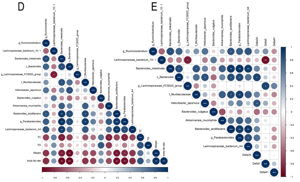 EA促進(jìn)了腸粘膜免疫中3個(gè)代表性基因Defa5、Defa20和Defa41的表達,其中Defa5顯著(zhù)上調(圖6A);EA還恢復了這些防御素的蛋白質(zhì)水平,其中Defa5和Defa41顯著(zhù)增加(圖6B)。斯皮爾曼相關(guān)系數分析結果顯示,Defa5和Defa34的蛋白質(zhì)水平與關(guān)鍵肥胖指數呈負相關(guān),包括體重、體脂百分比以及甘油三酯TG、總膽固醇TC含量(圖6C);,EA下調 Lachnospiraceae bacterium_10_1和 Bacteroides acidifaciens物種的相對豐度,與肥胖小鼠的關(guān)鍵肥胖指數呈正相關(guān)(圖6D);EA調節的腸道防御素表達與幾種腸道菌群相關(guān)(圖6E)。以上結果表明,腸道防御素的調節是EA拯救肥胖小鼠腸道微生物群的關(guān)鍵機制之一。