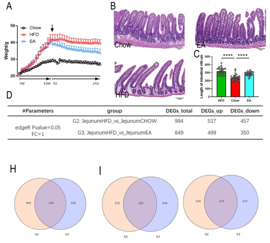 相較于HFD組,EA組顯示出顯著(zhù)地減肥效果(圖2A),并減少了附睪、腎臟和腹股溝區域的脂肪堆積??漳c是腸道脂質(zhì)消化和吸收的主要區域,HFD小鼠的空腸絨毛明顯長(cháng)于食物組(圖2B, 2C)。HFD組和正常對照組間共鑒定出994個(gè)差異表達基因DEG(圖2D-F),HFD組和EA組共鑒定出849個(gè)DEG(圖2G);通過(guò)取兩個(gè)比較組共有的DEG,作為EA直接調控肥胖的DEG,共檢測到共有基因299個(gè),其中上調的有165個(gè),下調的有133個(gè)(圖2H-J)。