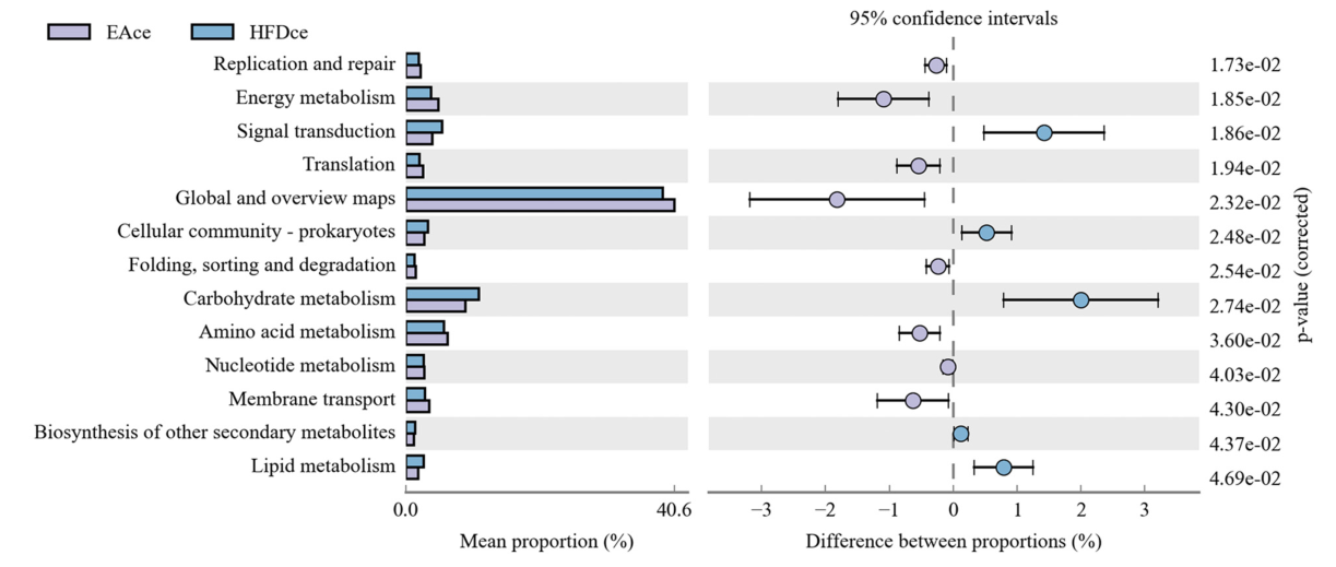 在EA干預21天后,HFD組中盲腸微生物組成被顯著(zhù)恢復(圖4 A&B),α多樣性(圖4 C, 4D)和β多樣性恢復(圖4E-G);通過(guò)LEfSe分析鑒定了9種特征細菌(圖4H);跟蹤EA處理3、7、14和21 d相對豐度的時(shí)間序列變化,篩選到肥胖小鼠盲腸10個(gè)相關(guān)物種,其中8個(gè)上調,包括G. Ruminiclostridium和 A. muciniphila;Tax4Fun預測了EA和HFD組間具有顯著(zhù)差異的13種KEGG通路;并且,EA干預能有效地下調脂質(zhì)代謝途徑,上調能量代謝途徑(圖5)。