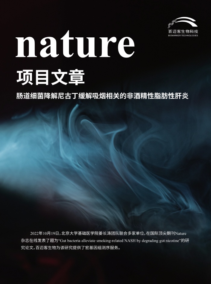 2022年10月19日,北京大學(xué)醫學(xué)部姜長(cháng)濤團隊聯(lián)合美國國立衛生研究院、浙江大學(xué)醫學(xué)院、復旦大學(xué)基礎醫學(xué)院和溫州醫科大學(xué)的研究團隊在國際期刊《Nature》發(fā)表了題為“Gut bacteria alleviate smoking-related NASH by degrading gut nicotine”的重磅研究。該研究解析了腸道尼古丁積累在非酒精性脂肪性肝炎進(jìn)展中的作用,發(fā)現了人類(lèi)腸道中一種能夠代謝尼古丁的內源性細菌,并提出了一種可能的減少吸煙加劇NAFLD進(jìn)展的途徑。百邁客為該研究提供了宏基因組測序服務(wù)。點(diǎn)擊了解詳情:Nature-宏基因組聯(lián)合多組學(xué)研究揭示腸道有益菌對非酒精性脂肪性肝炎的保護作用