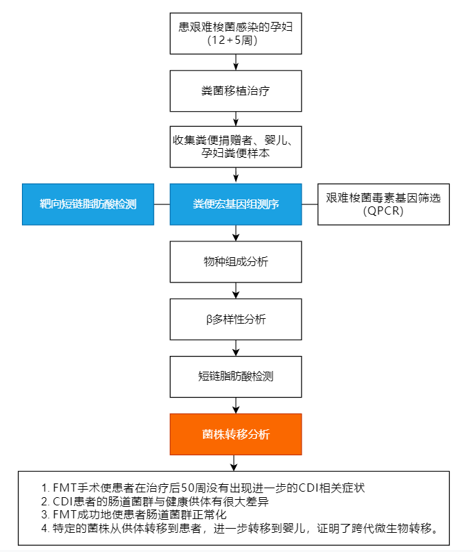 糞便菌群移植(FMT)能有效預防艱難梭菌感染(CDI)的復發(fā)。捐贈者特定的微生物群落可能會(huì )長(cháng)期植入受者體內,但可能會(huì )進(jìn)一步轉移到其他部位,包括將捐贈者特定的菌株垂直傳播給后代,目前還沒(méi)有進(jìn)行調查。在該篇研究中,作者報告了特定的細菌菌株從FMT捐贈者跨代傳播給一名患有CDI的孕婦,并進(jìn)一步傳遞給嬰兒。
