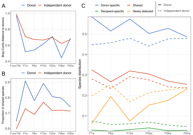 進(jìn)一步評估了患者與實(shí)際供體或獨立供體之間隨時(shí)間推移在物種/MGS 水平上的腸道菌群差異(圖2A)。供體和患者之間的 Bray-Curtis 距離在 FMT 前非常大,但在 FMT 后 1 周顯著(zhù)減少,此后呈逐漸增加趨勢,直到第 50 周,除了在第 26 周出現無(wú)法解釋的減少。估計了隨著(zhù)時(shí)間的推移患者和供體之間共有物種的比例(圖2B)。在 FMT 之前,患者有 64.5% 的物種與供體相同,而在 FMT 之后,該比例在第1周增加到 90.8%,并且在 FMT 后 50 周之前一直保持較高水平,盡管有下降趨勢。獨立供體與患者共享的物種要少得多(圖 B)。