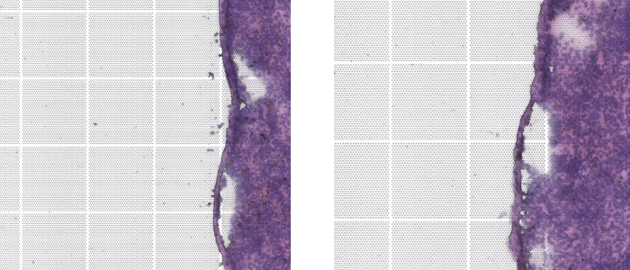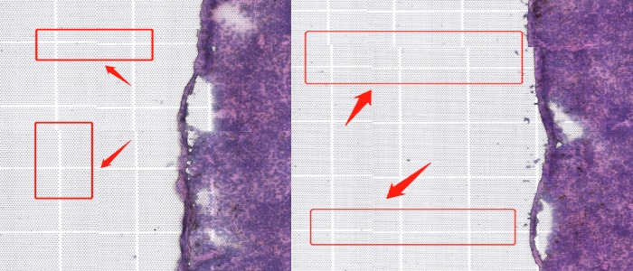 掃描顯微鏡產(chǎn)出的結果,是對片子各區域拍照后拼接而來(lái)的,部分型號的顯微鏡由于參數問(wèn)題在拼接過(guò)程中可能會(huì )產(chǎn)生“拼接錯誤”。一般情況下,拼接錯誤的誤差在5~10μm左右。如果分析的分辨率較高時(shí),存在“拼接錯誤”的圖像則會(huì )和實(shí)際位置產(chǎn)生錯位,進(jìn)而影響到數據分析。