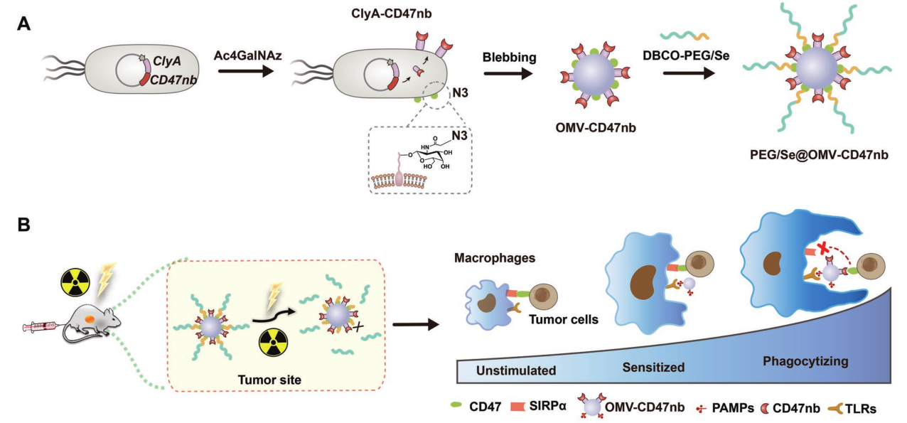 CD47納米抗體(CD47nb)融合到OMV表面(OMV-CD47nb),OMV-CD47nb可以同時(shí)與腫瘤細胞的CD47和TAMs的TLRs結合;外表面涂有含有二烯酰胺鍵(PEG/Se)的聚乙二醇(PEG)層,形成PEG/Se@OMV-CD47nb,PEG/Se層的修飾可以減輕了OMV-CD47nb的免疫原性,顯著(zhù)提高給藥劑量;
