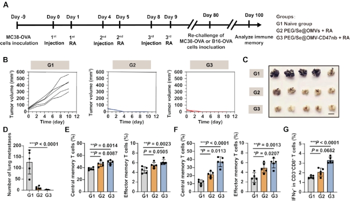 為了確定通過(guò)輻射觸發(fā)的OMV-CD47nb傳遞是否能激活免疫記憶,對構建好的PEG/Se@OMVs+RA、PEG/Se@CD-CD47nb+RA處理的MC38-OVA和B16-OVA皮下成瘤小鼠進(jìn)一步分析(圖4A)。結果顯示,PEG/Se@OMVs+RA和PEG/Se@CD-CD47nb+RA處理的MC38-OVA小鼠腫瘤沒(méi)有生長(cháng),達到100%的腫瘤抑制率(圖4B),但PEG/Se@OMVs+RA和PEG/Se@CD-CD47nb+RA處理的B16-OVA組分別達到了 91.2%和98.2%的肺部轉移抑制率(圖4C, D);與對照組相比,PEG/Se@OMVs+RA和PEG/Se@CD-CD47nb+RA治療得小鼠血液和脾臟的中央記憶型T細胞和效應記憶T細胞比例顯著(zhù)上調(圖4E, F);PEG/Se@OMVs+RA組中記憶T細胞比例略高于PEG/Se@CD-CD47nb+RA組,這與B16-OVA細胞的肺轉移抗腫瘤效果一致(圖4D);PEG/Se@OMVs+RA和PEG/Se@CD-CD47nb+RA處理的小鼠脾臟細胞仍然擁有識別腫瘤抗原的能力,表現為OVA抗原重新刺激上調CD3+CD8+T細胞中IFNγ+細胞的比例(圖4G)。以上結果表明,PEG/Se@CD-CD47nb+RA治療誘導腫瘤抗原特異地適應性免疫,激活了腫瘤抗原的免疫記憶,提供了長(cháng)期的腫瘤預防效果。