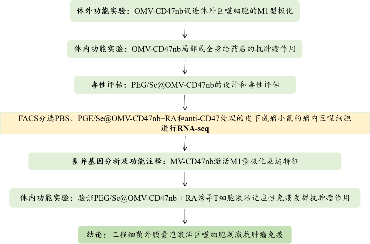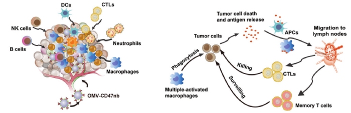 細菌衍生的外膜囊泡(OMV)是高免疫原性納米囊泡,已經(jīng)成為腫瘤免疫治療常用的傳遞載體;巨噬細胞作為腫瘤微環(huán)境(TME)中的抗原遞呈細胞,可以處理被吞噬的腫瘤細胞,并將腫瘤抗原呈遞給T細胞,從而激活抗原特異性免疫反應,腫瘤細胞表現出CD47“don’t eat me”信號的高表達,阻礙了巨噬細胞的吞噬作用;腫瘤相關(guān)巨噬細胞(TAM)與免疫抑制性M2極化巨噬細胞非常相似,與腫瘤免疫逃逸和腫瘤進(jìn)展有關(guān),TAMs的jing q高效激活是一種非常有前景的腫瘤免疫治療方法。