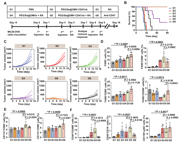 分別構建PBS、PEG/Se@OMV-CD47nb、RA(局部放射治療)、PEG/Se@OMV+RA、PEG/Se@OMV-CD47nb+RA、anti-CD47處理的MC38-OVA皮下成瘤小鼠模型(表達卵清蛋白的MC38小鼠結腸癌細胞系),評估抗腫瘤效果(圖2A)。結果顯示,90天后,PEG/Se@OMV-CD47nb+RA組小鼠存活率100%,PEG/Se@OMV+RA組小鼠存活率33.3%,其余組小鼠均全部死亡(圖2B);單獨RA與PEG/Se@OMV-CD47nb處理沒(méi)有引起明顯的抗腫瘤活性,而RA與PEG/Se@OMV-CD47nb聯(lián)合顯示出顯著(zhù)的抗腫瘤效果,但并且與臨床上使用的陽(yáng)性對照anti-CD47相比,CD47nb的抗腫瘤作用更強(圖2C)。