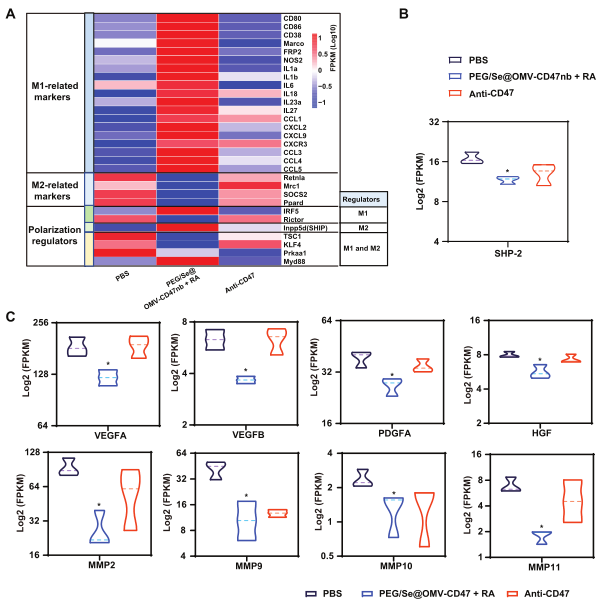 利用FACS分選出PBS、PGE/Se@OMV-CD47nb+RA和anti-CD47處理的皮下成瘤小鼠的瘤內巨噬細胞,進(jìn)行RNA-seq。分析結果顯示,與PBS組相比,PGE/Se@OMV-CD47nb+RA組M1型巨噬細胞maker基因表達水平上調,包括:CD80、CD86、CD38、Marco、FPR2、NOS2、IL-1α、IL-1β、IL-6、IL-18、IL-23a、IL-27、CCL1、CXCL2、CXCL9、、CXCR3、CCL3、CCL4和CCL5,M2型相關(guān)的marker基因表達水平下調,包括:Rentla、Mrc1、SOCS2和Ppard,提示與M1型相關(guān)趨化因子的表達增加可能是招募免疫細胞進(jìn)入TEM的原因;PGE/Se@OMV-CD47nb+RA組中M1型極化相關(guān)的轉錄因子IRF-5和Myd88表達水平上調,M2型極化相關(guān)的轉錄因子Rictor、TSC1、Klf4和Prkaa1表達水平下調(圖3A); 相較PBS組,PGE/Se@OMV-CD47nb+RA和anti-CD47組中CD47-SIRPα信號通路下游分子SHP2表達水平下調,可能與CD47的阻斷作用有關(guān)(圖3B)。