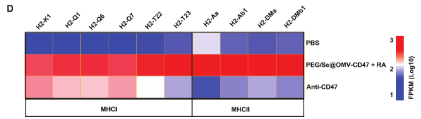 與PBS組相比,PGE/Se@OMV-CD47nb+RA組中的VEGFA、VEGFB、HGF、PDGFA、MMP2、MMP9、MMP10和MMP11表達水平下調(圖3C),這些基因與TAMs促進(jìn)腫瘤血管生成和轉移相關(guān);此外,多種MHC Ⅰ、MHC Ⅱ類(lèi)分子表達水平顯著(zhù)上調,表明腫瘤細胞的吞噬和抗原呈遞可能發(fā)生在TAMs中。
