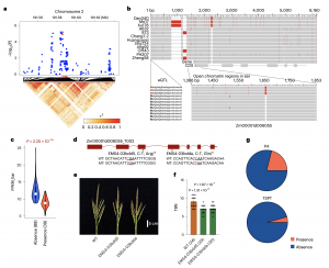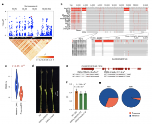 隨后,作者使用RNA-seq數據進(jìn)一步研究了不同pan-gene的表達譜??傮w表達豐度情況從核心、軟核心到可變基因逐漸降低,表明核心基因具有穩定和更廣泛的表達譜,而可變基因具有較低水平、組織特異性、品系特異性或條件依賴(lài)性表達。核心基因編碼區中非同義變與總突變的比率低于軟核心和可變基因(圖2f)??梢宰⑨尩幕虮壤龔暮诵?、軟核心到可變基因逐漸減少(圖2g)。以上結果表明,核心基因在進(jìn)化上更加保守。