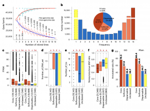 通過(guò)模擬分析發(fā)現,總基因集隨著(zhù)基因組的增加而增加,當n=12時(shí)接近穩定(圖2a),表明這14個(gè)玉米足夠具有代表性。核心基因的百分比隨著(zhù)玉米數量的增加而下降,但即使當n=14時(shí)也沒(méi)有穩定下來(lái),表明玉米擁有大量的非共享基因。