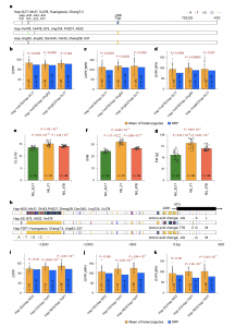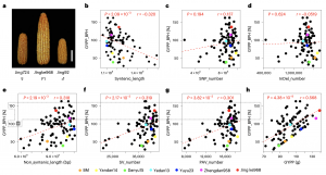 之前研究報道了雜種優(yōu)勢與分子遺傳距離(GD)存在弱正相關(guān)關(guān)系。本研究為了研究產(chǎn)量雜種優(yōu)勢與遺傳變異之間的關(guān)系,首先將基因組劃分為共線(xiàn)性和和非共線(xiàn)性區域。相關(guān)分析顯示,共線(xiàn)性區域長(cháng)度與GYPP的BPH呈顯著(zhù)負相關(guān)(圖5b)。共線(xiàn)性區域的SNPs和small InDels僅與GYPP的BPH呈弱相關(guān) (圖5c和5d)。相反,非共線(xiàn)性區域長(cháng)度、SV_Number和PAV_Number均與GYPP的BPH呈顯著(zhù)正相關(guān)(圖5e-g)。其中,SV_Number與GYPP雜種優(yōu)勢表現出強的相關(guān)性(圖5f)。SVs可以進(jìn)一步分為插入或缺失、串聯(lián)收縮擴張和重復收縮擴張。其中,插入缺失與GYPP雜種優(yōu)勢的相關(guān)性強。綜上所述,表明SVs的數量對GYPP的貢獻很顯著(zhù),支持了SVs在雜種優(yōu)勢中起主導作用這一觀(guān)點(diǎn)。