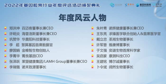 此次評選,聚焦基因檢測行業(yè)升級和變化,以基因檢測行業(yè)與資本市場(chǎng)為核心,由南方醫學(xué)網(wǎng)、基因谷、基因科技網(wǎng)等權威行業(yè)媒體投票選出,此次百邁客生物總裁兼CEO鄭洪坤先生入選,不僅是對個(gè)人在推動(dòng)基因檢測行業(yè)高質(zhì)量做出特殊貢獻的認可,也是行業(yè)對百邁客生物2022公司運營(yíng)的肯定。