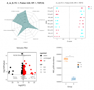 2、Z-score分析:Z-score是基于代謝物的定量值轉換而來(lái)的值,用于衡量實(shí)驗組相對于對照組的差異偏離情況。通過(guò)Z-score圖可展示不同兩組間差異代謝物的偏離情況。