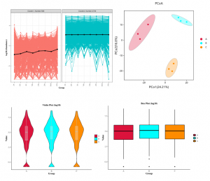 2、主坐標分析可用研究差異分組之間和組內樣本之間的變異度大小。PCoA圖交互式可實(shí)現數據標簽的顯示,更改散點(diǎn)形狀和大小,添加置信橢圓和填充顏色等自定義功能;