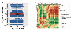 最后,為了進(jìn)一步準確了解成熟果實(shí)中轉錄水平與代謝物變化之間的關(guān)系,作者進(jìn)行了DEGs與DAMs之間的相關(guān)分析,其中,變化趨勢相同的DEGs和DAMs主要涉及類(lèi)黃酮、酚酸類(lèi)、氨基酸及其衍生物、萜類(lèi)、有機酸、脂類(lèi)等(圖7)。