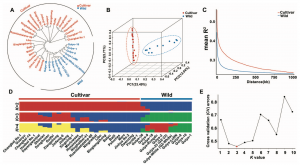 對26個(gè)典型的枇杷栽培種質(zhì)資源(代表全球不同地區的栽培種質(zhì)資源)和11個(gè)來(lái)自中國西南地區的野生種質(zhì)資源進(jìn)行了全基因組重測序,平均深度為22.49×,共鑒定出10,978,138個(gè)高質(zhì)量的SNP。系統發(fā)育和主成分(PCA)分析表明,野生種質(zhì)和栽培種質(zhì)聚為兩個(gè)不同的組(圖3A和B)。野生枇杷的核苷酸多樣性(π)(2.28×10?3)高于栽培枇杷(1.44×10?3),LD衰減速度快于栽培枇杷(圖3C),期望雜合度和觀(guān)測雜合度的平均值均顯著(zhù)高于栽培枇杷。進(jìn)一步利用Structure對種群結構分析顯示,當K=2時(shí),所有個(gè)體被清楚地細分為野生和栽培種質(zhì)的兩個(gè)特定分支(圖3D)。