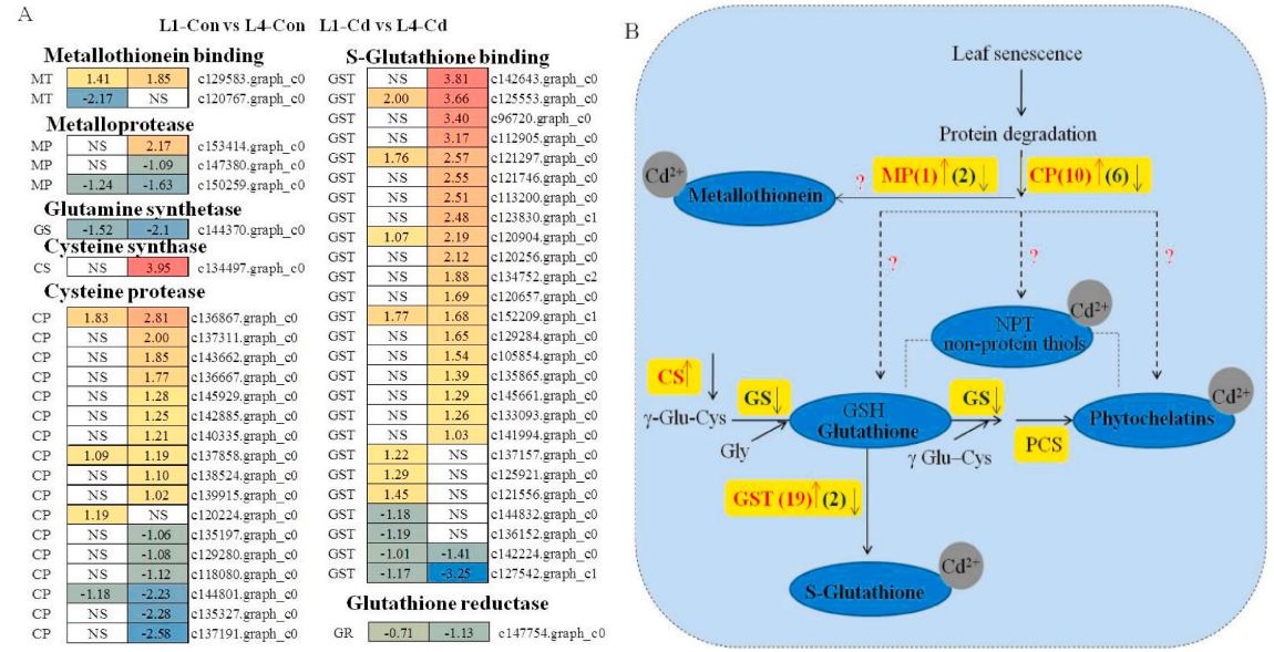 MT(金屬硫蛋白)是一組金屬結合蛋白,在金屬分配和穩態(tài)中起著(zhù)關(guān)鍵作用。1個(gè)上調基因(c129583.Graph_c0)和一個(gè)下調基因(c120767.graph_c0)編碼MT。Cd脅迫使上調基因的差異倍數比對照增加了23.8%,并完全抑制了表達下調的基因。結合Cd脅迫下MT含量的增加,作者的研究結果表明,MT-Cd結合可能在幼葉(L1)和衰老葉片(L4)的Cd解毒過(guò)程中發(fā)揮作用。半胱氨酸蛋白酶(CPs)是葉片衰老過(guò)程中負責蛋白水解活性的最豐富的酶。在該轉錄組中鑒定出17個(gè)編碼CP的基因。在對照組中,只有4個(gè)基因的表達有顯著(zhù)差異。Cd脅迫顯著(zhù)促進(jìn)CP表達,有10個(gè)上調基因在Cd處理組的差異倍數高于處理組,Cd處理組的6個(gè)基因下調倍數低于對照組。然而,PC的蛋白水解活性是否與衰老葉片中Cd的積累有關(guān)尚不清楚。