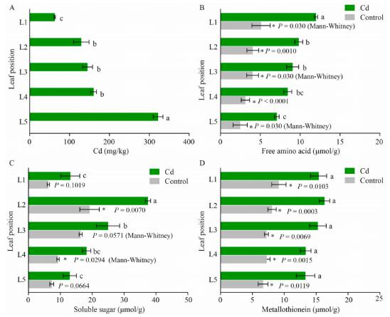 不同葉片Cd積累量顯著(zhù)不同。葉片Cd濃度隨葉片數量的增加從上到下顯著(zhù)增加,L2、L3、L4和L5的Cd濃度比幼葉(L1)增加了2.1、2.3、2.5和5.1倍。幼葉(L1)積累Cd最少,而衰老葉(L5)積累Cd最多。Cd處理顯著(zhù)提高了各葉片游離氨基酸含量,但沒(méi)有改變其隨葉片衰老逐漸下降的趨勢,幼葉中游離氨基酸含量(L1)最高,然后隨著(zhù)葉片衰老逐漸降低(圖1B)。衰老葉(L5)中游離氨基酸含量最低。成熟葉片中可溶性糖含量(L2)最高,Cd處理顯著(zhù)提高了L2和L4的可溶性糖含量,然后隨著(zhù)葉片衰老逐漸降低。衰老葉(L5)和幼葉(L1)的可溶性糖含量顯著(zhù)低于綠色成熟葉。鎘脅迫下,與對照組相比,Cd處理顯著(zhù)提高了所有葉片中的金屬硫蛋白含量,不同葉片金屬硫蛋白含量無(wú)顯著(zhù)變化。
