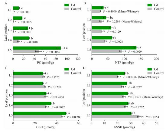 PC、GSH和NPT參與了超積累劑的Cd解毒機。Cd脅迫和對照組的植物螯合素(PCs)均隨葉片老化顯著(zhù)增加。Cd處理顯著(zhù)提高了各葉片PC含量,非蛋白硫醇(NPTs)含量也隨著(zhù)葉片衰老而顯著(zhù)增加,但隨葉片衰老的增加趨勢沒(méi)有變化。Cd處理顯著(zhù)增加了衰老葉片(L4和L5)的谷胱甘肽(GSH)含量,但沒(méi)有提高幼苗和成熟苗的GSH含量。由此可以推斷,GSH、PC和NPT的增加及其與Cd的結合可能促進(jìn)了衰老葉片中Cd的積累。Cd處理顯著(zhù)增加了幼葉和成熟葉的氧化谷胱甘肽(GSSH)含量(L1和L2),但降低了衰老葉(L5)的GSSH含量。由于氧化后的谷胱甘肽(GSSH)可被還原為還原型谷胱甘肽(GSH),還原性谷胱甘肽(GSH)可以通過(guò)GST進(jìn)一步催化GSH-Cd結合,GSSH向GSH的轉化與Cd在衰老葉片中的積累是一致的。