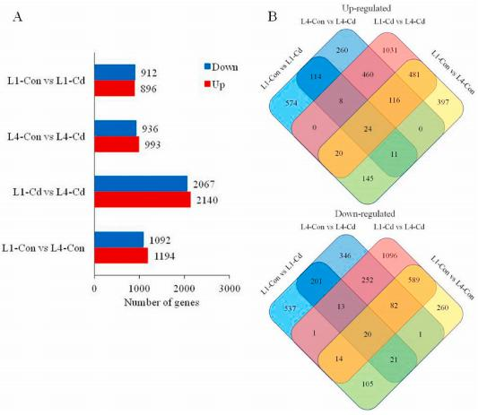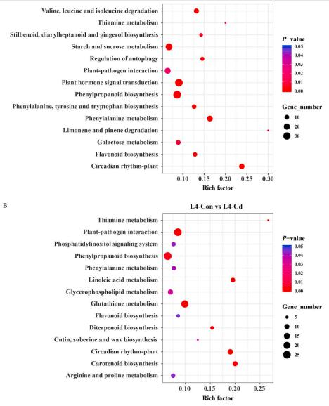 為了了解差異基因的功能,作者進(jìn)行了GO富集分析。四組的差異基因在節律過(guò)程、信號傳導和代謝過(guò)程等生物過(guò)程中都有20個(gè)豐富的分類(lèi)。值得注意的是,與對照組相比,脫毒組的差異基因在幼葉和衰老葉中都有富集(L1-ConvsL1-Cd和L4-ConvsL4-Cd),但在幼葉和衰老葉的對照組和處理組中沒(méi)有明顯富集(L1-CdvsL4-Cd和L1-ConvsL4-Con)。