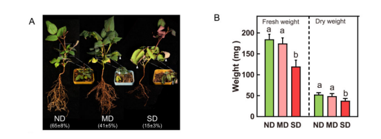 干旱或缺水引起的脫水是世界上許多地區植物面臨的一種嚴重的非生物脅迫,嚴重制約著(zhù)植物的生產(chǎn)力和生存。許多生物化學(xué)、生理和遺傳性狀已在不同的植物組織中進(jìn)化出來(lái),特別是根和葉,以應對干旱脅迫。根是感知水分缺乏最敏感的器官,并相應的調節水分和養分的吸收。在有限的水分條件下,它們可以通過(guò)表型和結構上的改變來(lái)增加枝條和葉片對水分的吸收,以維持正常的水分利用。葉片是光合作用和蒸騰作用的主要器官,調節水分的吸收和流失。葉片對干旱的反應是萎蔫、氣孔關(guān)閉、角質(zhì)層蠟沉積和減少光合作用,以減少水分的過(guò)度流失。因此,根系和葉片是調節水分在土壤和水分之間流動(dòng)的最重要器官,但其對干旱脅迫響應的分子機制尚不清楚。