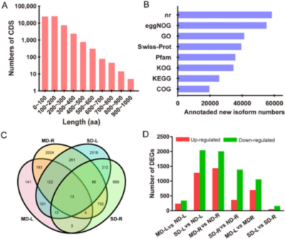 為了闡明干旱響應的分子機制,對不同處理植株的葉(L)和根(R)進(jìn)行了轉錄組測序。6個(gè)樣本(每個(gè)樣本3個(gè)生物重復)共18個(gè)cDNA文庫,包括ND-L、MD-L、SD-L、ND-R、MD-R和SD-R。從最初的116,192,367 raw reads中,提取了115,374,531 (99.29%) clean reads,組成玫瑰全長(cháng)非嵌合轉錄組。通過(guò)與Rosa chinensis 基因組比對,在轉錄組中鑒定出了48,549個(gè)基因,占基因組長(cháng)度的21.46%。此外,共鑒定出59,404個(gè)開(kāi)放閱讀框(ORF),如圖2A所示,只有19個(gè)編碼序列(CDSs)編碼>800個(gè)氨基酸的多肽,而58%的CDSs編碼長(cháng)度在100 – 400個(gè)氨基酸的小肽(圖2A)。最后,89,044個(gè)非冗余轉錄本中的58,753個(gè)可以被注釋到不同的數據庫中(圖2B)。
