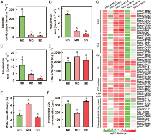 鑒于玫瑰葉片在干旱脅迫下顯著(zhù)枯萎(圖1A),因此對ND、MD和SD生長(cháng)條件下葉片的光合參數進(jìn)行了研究。雖然所有組的總葉綠素含量沒(méi)有顯著(zhù)差異(圖3 D),但干旱脅迫顯著(zhù)降低了Pn、Gs和Tr指數,在SD脅迫下降低的幅度比 MD更嚴重(圖3 B、C、F)。葉片中的Ci水平對MD和SD脅迫有不同的相應。MD處理下的平均Ci降低了111 μmol/mol,長(cháng)期干旱后Ci值增加了62.33μmol/mol,恢復正常。由此可見(jiàn),干旱脅迫不利于玫瑰植株的光合性能,限制了葉片的生長(cháng)。MD條件下的水分利用效率(WUE)高于ND和SD(圖3E),說(shuō)明輕度水分虧缺增加了葉片有效利用水分的能力。為了進(jìn)一步闡明其分子機制,對與光合作用途徑相對應的轉錄組數據進(jìn)行了分析。干旱脅迫下與光合作用相關(guān)的DEGs包含編碼PS II、PS I、葉綠體三磷酸腺苷(ATP)合酶亞基(ATP合酶)和葉綠素a/b結合蛋白。如圖3G所示,幾個(gè)PSII(gene 14042,gene 26289等)、PS I (gene 29343,gene 10875等)和ATP合酶(gene 28095, gene 31836等)基因在SD脅迫下表達下調至少0.5倍(圖3 G)。綜上所述,干旱脅迫誘導了玫瑰葉片的光合動(dòng)態(tài)在轉錄水平上的變化。