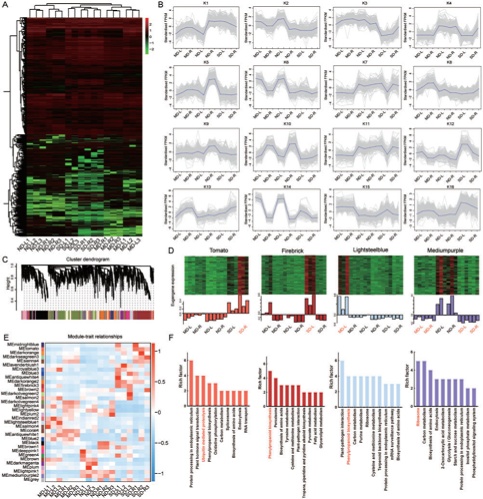 我們還通過(guò)加權相關(guān)網(wǎng)絡(luò )分析來(lái)確定與干旱脅迫響應相關(guān)的基因簇或模塊。所有基因聚類(lèi)為33個(gè)模塊(圖6 C、E),其中tomato modules與SD-R、fire-brick與SD-L、light steel blue與MD-L、medium purple與ND-L和ND-R顯著(zhù)相關(guān)(圖6 D)。各模塊KEGG富集分析顯示,干旱脅迫下大部分樣品富集苯丙素生物合成(ko00940)和核糖體(ko03010),SD-R樣品富集最顯著(zhù)的通路是內質(zhì)網(wǎng)蛋白加工(ko04141)(圖6 F)。綜上所述,上述途徑調節了玫瑰葉片和根系對干旱脅迫的響應。