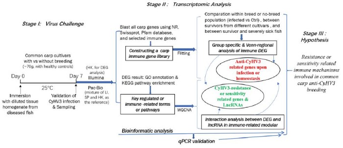 鯉魚(yú)皰疹病毒-3(CyHV-3)感染是鯉魚(yú)養殖的主要威脅,可導致鯉魚(yú)大量的死亡。CyHV-3可通過(guò)削弱宿主的免疫系統而使其死亡,導致其對病原微生物易感性,并可能在感染后6至10天內出現發(fā)病和死亡。感染CyHV-3后存活下來(lái)的鯉魚(yú)可以抵抗這種病毒未來(lái)的感染。由于CyHV-3在鯉魚(yú)中存在潛伏期和持續性攜帶期,遺傳背景對于了解對病毒的耐藥性至關(guān)重要。德國鏡鯉品系G4是中國廣泛栽培的鯉魚(yú)品系,但因CyHV-3病毒引起高死亡率。然而目前在研究抗CyHV-3免疫機制的詳細免疫系統網(wǎng)絡(luò )方面,還缺乏系統的研究。最近的研究表明,lncRNAs在不同類(lèi)型病原體感染時(shí)的廣泛差異表達,表明lncRNAs在魚(yú)類(lèi)免疫反應中起著(zhù)關(guān)鍵作用。然而,在CyHV-3感染期間,鯉魚(yú)體內的特異性L(fǎng)ncRNA對免疫反應的調節尚未被研究。第三代測序(如PacBio)可以解碼比第二代測序方法(如Illumina)更長(cháng)的基因序列,包括mRNA和非編碼RNA在內的更高質(zhì)量的轉錄本組裝,可能提供對遺傳抗性機制的更詳細理解。在本研究中,為了揭示鯉魚(yú)抗CyHV3育種中涉及的免疫機制,使用圖1所示的策略,對CyHV-3激發(fā)期間的mRNA和長(cháng)非編碼RNA(lncRNA)進(jìn)行了整合轉錄組學(xué)分析。對來(lái)自繁殖品系或非繁殖品系的存活鯉魚(yú)和健康對照鯉魚(yú)的免疫相關(guān)轉錄本進(jìn)行了分析。