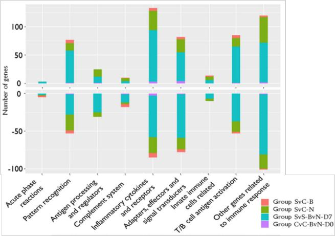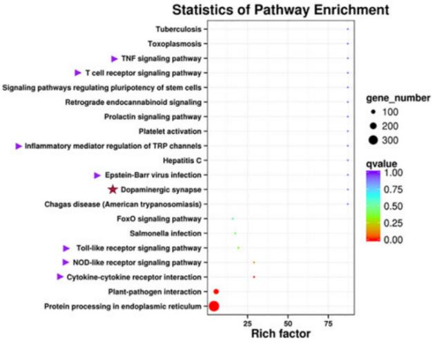 在CyHV-3感染后第0天和第7天提取鯉魚(yú)頭腎組織,并通過(guò)Illumina和PacBio測序分析轉錄組。在對涉及的GOterm和KEGG途徑進(jìn)行分析。加權基因共表達網(wǎng)絡(luò )分析用于揭示lncRNA對免疫基因的調節。結果表明,繁殖鯉魚(yú)品系通過(guò)一種特定的先天免疫機制對CyHV-3感染產(chǎn)生了顯著(zhù)的抗性,主要的生物學(xué)過(guò)程是自噬、吞噬、細胞毒性和凝集素和MUC3阻斷病毒。此外,還有免疫抑制信號途徑,如IL21R對STAT3的抑制,PI3K介導的感染時(shí)多巴胺對炎癥的抑制,以及NLRC3在穩定狀態(tài)下對STING的抑制。從非抗性品系中還發(fā)現了CyHV-3的可能易感因素,如ITGB1、TLR18和CCL4。本研究結果還表明,LncRNA調節的Nramp和PAI分別促進(jìn)病毒感染和感染細胞的增殖,而T細胞白血病同源框3(TLX3),以及l(fā)ncRNA的半乳糖凝集素3可能在抗病制中發(fā)揮作用。因此,免疫遺傳不敏感或易受CyHV-3感染的免疫因子已被揭示。